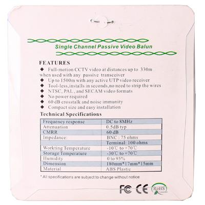 Transmit high-quality CCTV video over long distances with this 2-pack of Video Balun CCTV BNC to CAT5 Passive Transceivers. These baluns enable full-motion video transmission up to 330m using standard CAT5 cabling and even further (up to 1500m) with an active UTP video receiver. Installation is tool-less and takes seconds—no wire stripping required. Compatible with NTSC, PAL, and SECAM video formats, these passive transceivers require no power and offer exceptional 60dB crosstalk and noise immunity. Ideal for extending your CCTV system's reach cost-effectively.